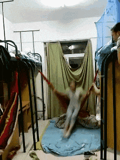 真够皮的,居然在寝室里玩荡秋千,这么小的空间不摔倒才怪呢