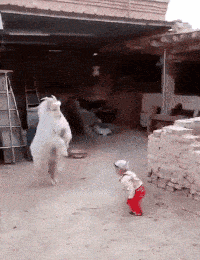 山羊:惹不起惹不起,我要是顶了你,晚上全家人不都得吃羊排啊!