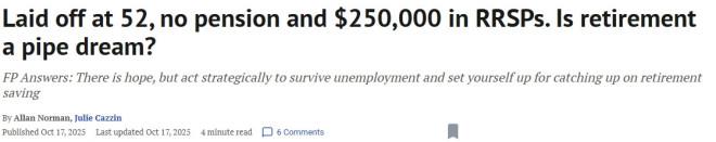 近日,《金融邮报》上一则理财问答引发热议。一位读者Ryan L.问道:“我今年52岁,公司马上要关闭,我也要被裁员了。工作机会不多,我40岁才开始为退休存钱,RRSP里不到25万加币,没有公司养老金,现在很担心未来。我该怎么办?”