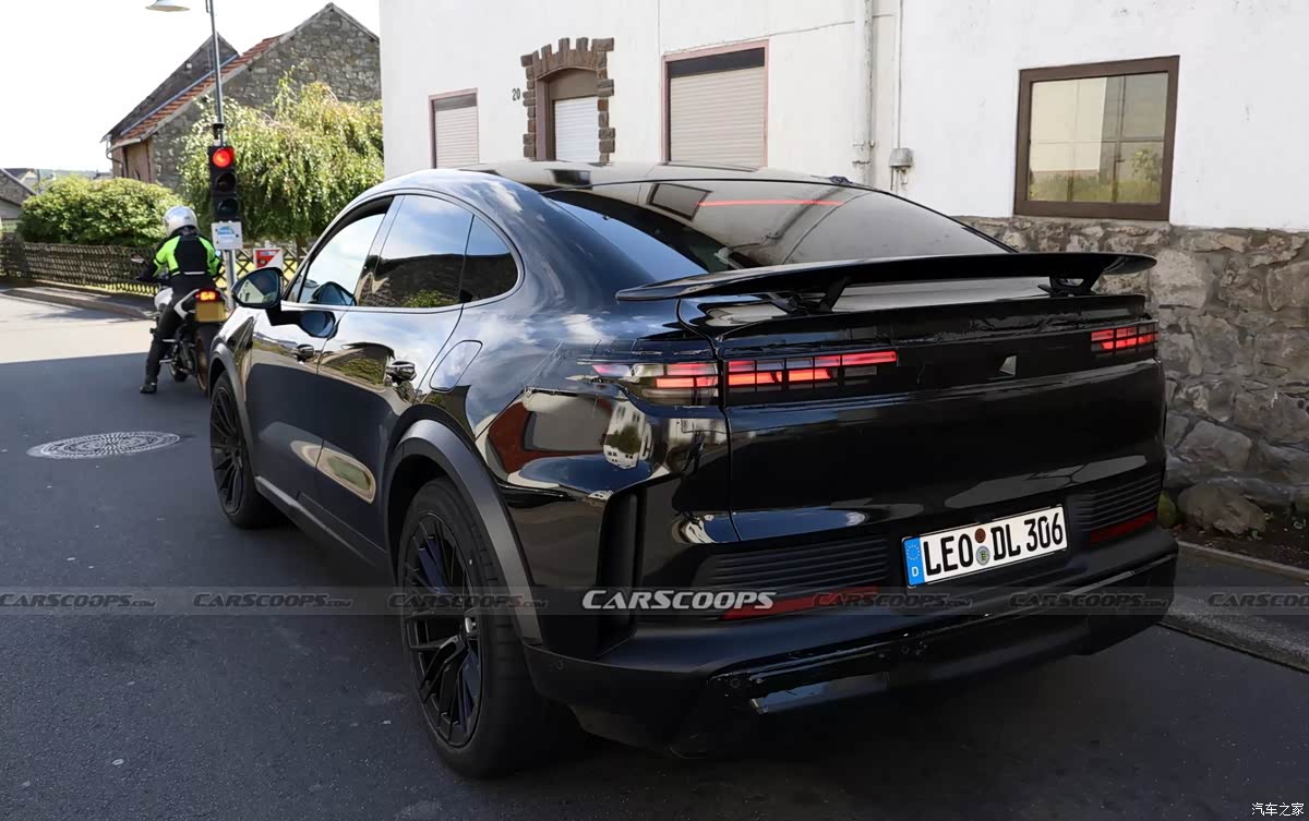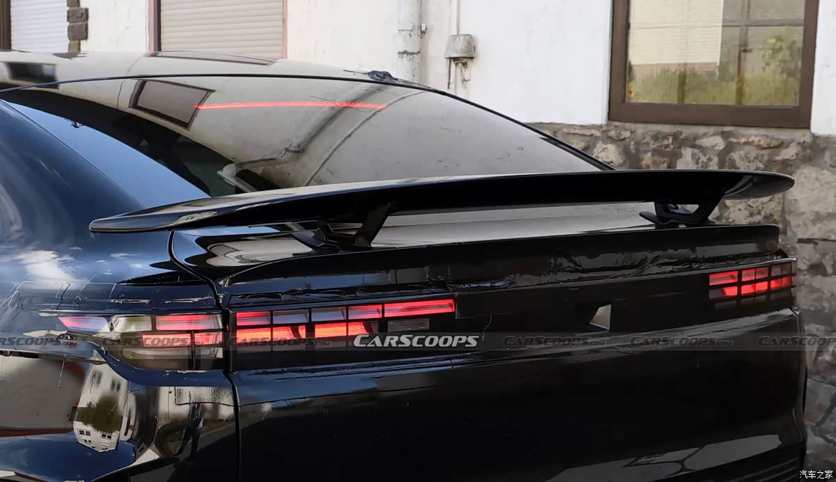 车辆尾部,新车采用了全新风格的大灯组,也很有辨识度,后包围看上去造型更加夸张,整体厚实,并且两侧有动感的导流槽。新车更大的亮点是尾部配备了电动后扰流板,并且尺寸相当大,引人注目。