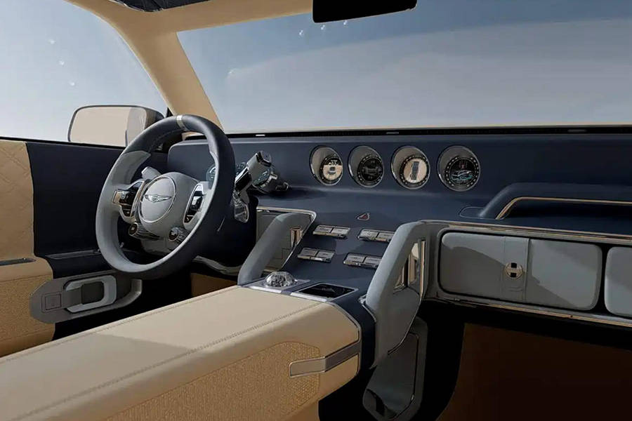 车内部分,捷尼赛思X Gran Equator概念车融合了“复古与现代”的对比美学,中控区域的核心是一组四圆仪表盘,贯穿式的仪表台同样去繁就简,而可旋转的前排座椅和灵活的储物解决方案进一步提升了车内的实用性。