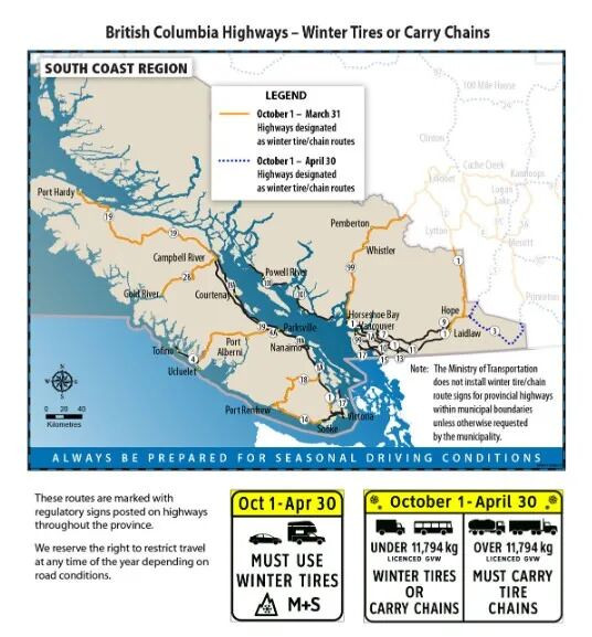 省政府要求,乘车在BC北部和内陆地区的任何高速公路、南海岸部分高速公路的路段(包括海天高速公路)以及温哥华岛部分高速公路的路段(包括马拉哈特高速公路和 4、14 和 28 号高速公路)行驶时,必须安装雪胎。