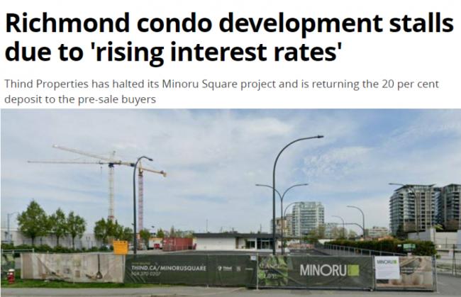 而在大温地区,突发事件也有发生。最近,开发商Thind旗下的列治文Minoru Square项目爆出将停止开发的消息。接下来项目将停建,陆续退还买家购买楼花的定金。