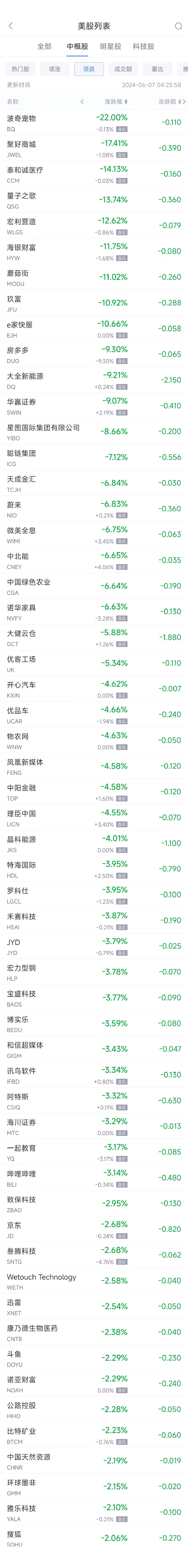 领跌中概股列表: