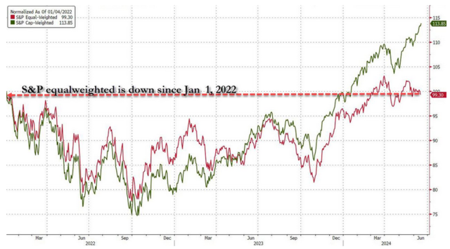 过去两年,标普500市值加权指数和标普500等权重指数之间的表现差距愈来愈大,前者高歌猛进,后者几乎原地踏步。