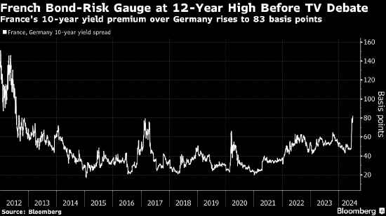 随着投资者仍对即将到来的法国议会选举紧张不安,该国国债下跌,相较于德国国债的收益率溢价扩大至新高。
