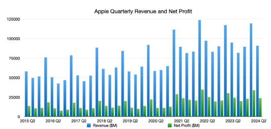 苹果的命运在很大程度上依赖于iPhone,iPhone是迄今为止苹果最大的收入来源。2024财年第二季度,iPhone销售额为460亿美元,同比下滑10.5%,占公司净销售额的50.6%。第三财季,面对激烈的市场竞争,