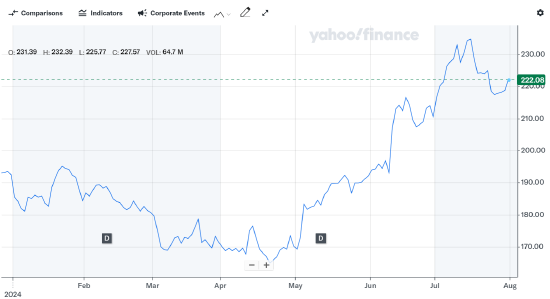 截至7月31日,分析师给予苹果的平均目标股价为226.88美元,而苹果当前的实际股价徘徊在222美元左右。