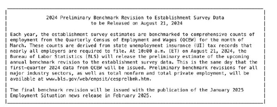 而根据美国劳工统计局公告,2024年就业及工资季度普查(QCEW)就业数据将于8月21日(本周三)发布。每年的调查预估都是以3月份就业及工资季度普查(QCEW)的综合就业人数为基准。这些数据来源于几乎所有雇主都需要提交的州失业保险(UI)纳税记录。美国东部时间2024年8月21日上午10点,美国劳工统计局(BLS)将发布基于年度基准调查数据修订的初步估计数据,同一天也将发布QCEW第一季度数据。而最终数据将在2025年2月发布2025年1月就业状况时发布。