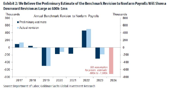 该数据或来源于高盛的一份报告。高盛研报图表显示,该机构认为劳工统计局将下调基于普查的初步就业数据,下调幅度高达60-100万。