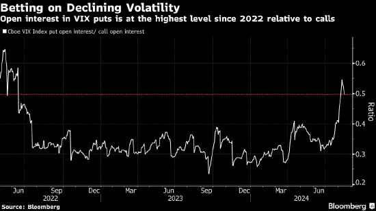 华尔街仍祈祷今年夏天重挫的痛苦已经过去,标准普尔500指数与历史高点相距2%。彭博汇编的数据显示,交易员认为未来市场平静,相对于押注VIX指数上涨的合约,押注该指数下跌的期权未平仓合约徘徊在2022年6月以来的最高水准附近。
