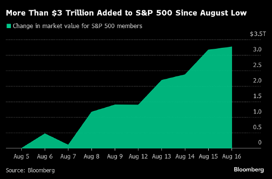 8月初全球经济增长恐慌引发市场重挫,后来标普500指数出现3.3万亿美元的强劲反弹,如果发生上述“意外”,反弹可能岌岌可危。多头在这波反弹中重掌主导地位,该基准股指连续七个交易日上涨,美国银行引用EPFR Global数据显示,截至周三的一周内,投资者向美国股市投入了55亿美元。