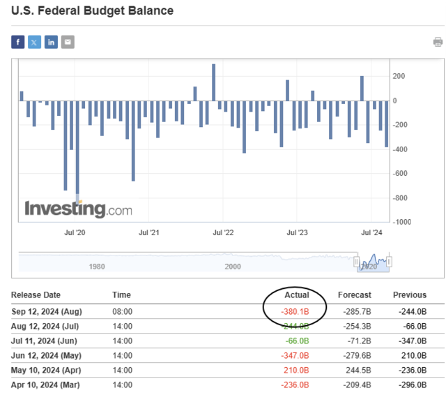 来源:华尔街见闻 截至8月的2024财年前11个月,美国联邦政府财政预算赤字近1.9万亿美元,同比增长24%,全财年赤字或创新冠疫情以外年度新高,利息成本增长30%至创纪录的1.05万亿美元,8月末偿债利率3.35%,创2009年来新高;8月赤字3800亿美元创两年新高,主要源于取消学生贷款减免计划。 美联储将政策利率保持在二十余年来高位带来的高利率环境让美国政府入不敷出的问题进一步恶化。 美东时间9月12日周四,美国财政部公布月度联邦政府收支报告,披露截至自然年2024年8月,联邦政府2024财年前11个月的财政预算赤字达到1.897万亿美元,同比增长24%;政府收入同比增长11%至4.391万亿美元,政府支出增长14%至6.288万亿美元。本财年只剩一个月就结束,到8月的数据显示,在没有紧急情况或战争的情况下,全财年的赤字势将继续较前一年两位数增长,并可能创下新冠疫情时期以外的年度赤字最高纪录。 本财年前11个月的美国政府赤字依然主要受到债务利息越滚越大影响。2023财年,美国政府的财政赤字将近1.7万亿美元,全年债务的净利息支出约6590亿美元,约占财政支出的15%。截至8月的本财年11个月内,净利息支出8430亿美元,同比增长33.8%,在财政支出中占比13.4%。而且本财年11个月的利息成本史上首次突破1万亿美元大关,达到1.049万亿美元,同比猛增30%。