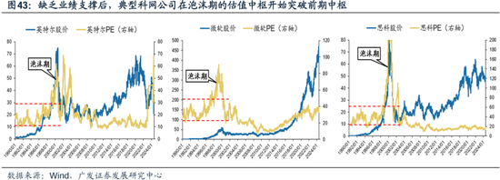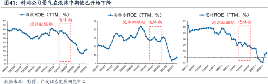 (二)业绩高景气是泡沫的催化剂,但龙头业绩在泡沫后期已经开始回落 美国经济周期转弱、产业周期放缓,相应影响了科网龙头的景气度。但我们看到,景气放缓并不直接对应着股价的下行,在整个泡沫的后期,科网龙头的ROE和业绩增速均已率先回落。 产业突破时期龙头公司ROE在30-40%高水平;但科网公司景气在泡沫中后期已开始下降。从下图可以看出,思科、英特尔和微软的ROE最高水平是在进入“泡沫期”之前就出现了——他们在1997年三季度的ROE年化水平分别达到了44%和39%,但此后便开始回落。直到1998年三季度,三家公司的ROE再次开始回升;但是好景不长,这两家公司的ROE从1999年下半年又再次开始回落,并且出现了中枢的下移。