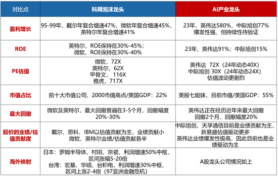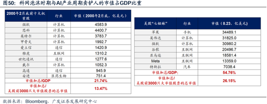 因此,无论是催化泡沫破灭的力量(大幅衰退和美元走弱)还是实际流出的资金风险(美股流动性),目前仍然与2000年尚不可比拟 AI七姐妹与90s科网巨头的估值/涨幅/股价驱动力/最大回撤等全方位比较:由于AI产业辐射面还没有到达科网水平,从七姐妹的市值占比、估值、第一波涨幅斜率等指标来看,确实已经胜过了90s科网龙头同期的表征,存在局部泡沫化的风险,这也对AI业绩爆发的持续性及未来商业化的进展提出了更高的要求 下图:科网顶峰10个巨头企业的市值/美国GDP约为22% ;而AI七姐妹的市值/美国GDP约为54%。