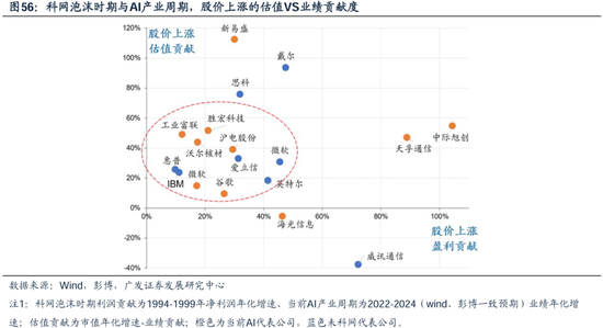 考虑A股AI产业链的相关公司,将近2年的股价上涨拆分为估值VS业绩,目前基本上大多数公司的上涨由业绩/估值双击驱动,个别公司的估值驱动更大。 下图可见,科网时期(蓝色点)估值贡献度更大,当前AI时期(黄色点)业绩/估值贡献基本相当。
