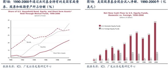 90年代大幅流入权益资产:美共同基金的规模扩张7倍,而权益基金规模扩张20倍。401k计划允许个人将部分工资投入股市,股票投资在居民资产配置中的地位上升、并超过了债券,美国居民通过共同基金持有的美股占比持续增长。 据ICI,1990年,美国共同基金规模为1.1万亿,其中权益基金规模仅0.2万亿,占全部共同基金规模比重为22.4%。随着国内外资金流入美股权益基金规模不断上升,美股权益基金资产规模也从1990年的0.2万亿美元增长到2000年的4.0万亿美元,扩张了近20倍,其占全部共同基金比重也上升至57%。