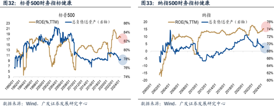 此外,资产负债表角度来看,08年以来,美国加杠杆主体主要是政府部门,当前居民和企业的资产负债表都相对健康。历史上来看,衰退都是发生在居民或企业杠杆率运行到阶段高位的时候。 最后,这轮高利率环境,上市公司盈利能力受损并不明显。一方面对应的是宏观经济数据的韧性,另一方面则来自人工智能新兴科技的加持。 当前,标普500、纳指的ROE水平均位于历史高位,与此同时,负债率水平位于历史低位。