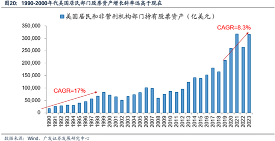 在本轮疫情后经济韧性与科技趋势的双重驱动下,全球资金持续流入美股市场。然而,与1990-2000年期间的股票资产增长相比,目前的增长斜率相对较缓和。美国资产负债表数据,美国私人部门持有的权益资产,在90-99年扩张了5倍,年化增长17%,而2000年至今20余年仅扩张4倍,19-23年年化增长也仅8.3%,表明虽然美股依然吸引着全球资金,但其增长速度已显著放缓。