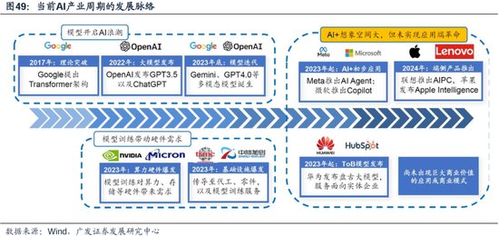 (一)AI产业链的完整度和辐射面不及90s科网,投资范围更加狭窄 上一轮计算机浪潮的完整发展脉络:半导体、个人计算机、硬件和操作系统、辐射式的软件革命、互联网。互联网开始与传统行业深度融合,出现了“互联网+零售”“互联网+支付”等新模式,是一次从无到有的场景革命。 当前AI处于基础设施铺设与硬件需求爆发时期,暂未实现应用端革命。 24年有大模型及应用的预期,但没有到达商业化落地的阶段。