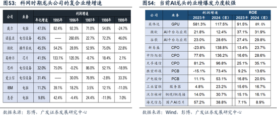 (三)AI业绩爆发性强,高估值隐含了对未来几年高增长的预期 美股AI龙头这种来势凶猛的上涨,跟业绩的爆发性及乐观指引预期直接相关。 对标科网,本轮AI“卖铲人”业绩爆发力度更强,但与科网当时5年以上的复合高速增长相比,本轮的持续性暂且未知。当前AI产业A股与美股的核心标的,业绩已有爆发呈现,ROE亦处高位(不乏30%以上),但能否有持续的业绩爆发还需看到供给端的瓶颈突破、以及应用端及新的商业模式涌现带来的增量需求。