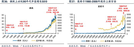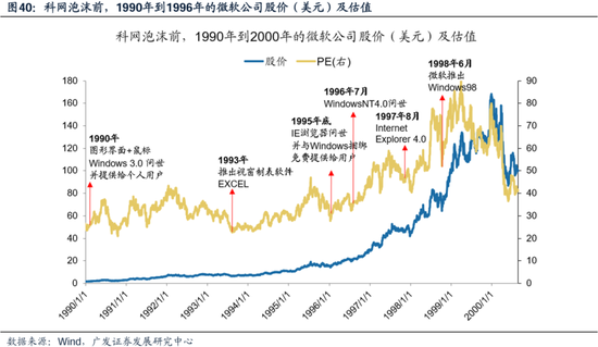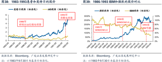 从技术走向商业、并且打开TO-C的使用场景,是计算机科技巨头能够拔估值的关键节点—— 第一:从技术走向产品(找到商业化路径)。操作系统开发商的微软和处理器制造商的英特尔处于不可替代的位置,关键技术突破的时点都对应股票主升浪:例如英特尔给每台PC一颗奔腾的芯,从生产低性能的微处理器,到1986年研制出的32位微处理器快速扩大份额,到93年奔腾处理器,技术奠定霸主地位,也甩开了和其它公司的股价差距。 第二:打开To-C端使用场景。IBM公司在设立之初的客群一直是政府部门、军方、银行和科研院所,错过也缺乏经营To-C终端消费型产品的经验,在上世纪80-90年代的竞争中逐渐成为落伍者,93年IBM出现亏损也带来股价下跌;to-c上苹果和微软做的比较成功,例如1984年第一台苹果电脑Mac机成为老百姓买得起、操作界面简介的个人电脑。 技术转化为产品的爆点(微软90年Window3,英特尔93年奔腾处理器),和用户尤其是To-C用户场景的打开(苹果84年第一台面向个人的PC电脑,雅虎94年创造面向To-C用户的门户网站),这都是科技浪潮中股价主升浪的催化剂。
