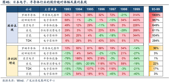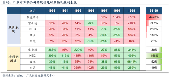 (四)以日本为例,科网泡沫的海外映射情况 关于日本科技行业在整个科网过程中的表现,我们在去年的报告《杠铃策略之日本演绎:90年代日本科技》中已有详细的展开。 90年代,受全球科技创新影响,日本制造业的发展趋势向TMT行业转换,算是经济降档过程中一段蓬勃发展的产业趋势。 这个过程中日本具备相对产业优势的硬件类,得到了快速的发展(电子零部件、半导体)。诞生了好公司(业绩复合增速高),也是好股票(表中上半部分是股价,大多年份上涨显著)。