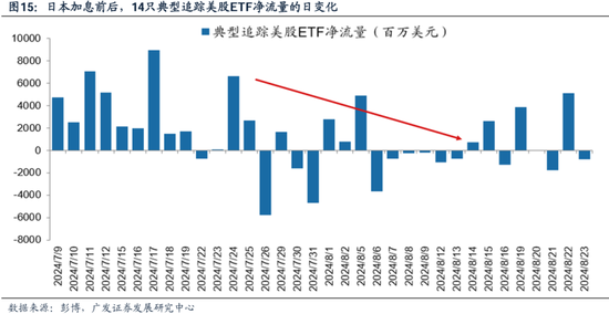 (三)当前的问题:美经济韧性+强美元预期是否逆转?是否引发全球资金波动? 美股资金的持续流入趋势,是否会有阶段性的再均衡,是我们当下需要重点关注的变化。我们从美股市场上14个典型的、资产规模较大的美股ETF净流量变化来观察(包括宽基ETF和科技股ETF),7月上半月资金基本呈净流入状态,7月31日日本央行加息前后至8月上旬,资金开始转为流出。8月中旬之后,再度转向平稳。