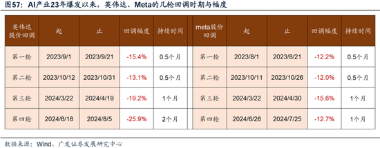 (四)科网龙头当年也会出现20-30%的回撤,关键是后续的业绩指引能否延续 23年AI产业爆发以来,英伟达股价出现过4次超过10个点的回撤,而24年8月的回撤更是超过了25%,也是一轮持续最长的调整,引发了市场的担忧。