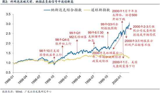 科网泡沫并非一日筑成,也并不是一下子破灭,自98年起一系列的负面信号都并未逆转泡沫最后的疯狂。