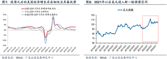 这种全球的相对增长优势,与疫情之后的美国情形非常相似。 2020年以后,由于疫情恢复过程中经济具备韧性,及高通胀催生的高利率环境,美元也处于强势区间。疫情之后,美国经济增长趋势在全球也具备相对比较优势,强势美元与90年代境况相似。
