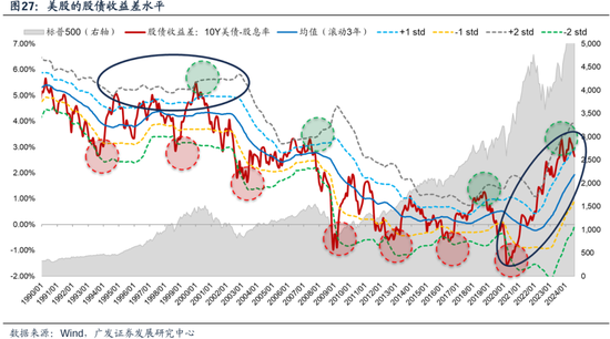 另一个角度来看,从美股/美债的大类资产比价指标来看,当前也未达到2000时期的失衡状态。 2000年股票相对于债券已经吸引力大幅下滑(股债收益差失衡,处于+2X,意味着股票的风险较高);2020年美股相对于美债有很高的吸引力;目前,美股股债的吸引力相当,未达到2000年的极度失衡状态。