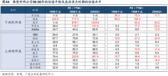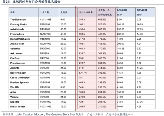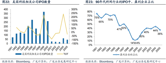 (五)股市流动性的泛滥程度不及当初,资产比价和风险偏好不及当初 1995-2000年,平均每年有250家科技IPO融资,且实现盈利的公司占比较小、均实现了暴涨。1990年代,美股科技板块IPO融资规模激增。1998年至2000年三年时间里,美国科技板块相关的IPO数量达到744个,而在2000年之后的5年时间里,IPO总数仅为168家。 这三年中,美国科技相关的IPO公司共筹集资金超841亿美元,三年Cagr达73.69%。IPO盈利企业的数量下降,意味着风险偏好上升、流动性泛滥。而投资者也对上市企业盈利不做任何要求,1999-2000年间美股IPO企业盈利公司仅占14%。 如果公司后缀跟着“.com”,那么无关其基本面是否好,都会受到大量投资者的追捧。(广发计算机组,《以产业链ROI的角度如何看新技术发展过程中的两面性》)