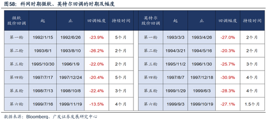 事实上,微软、英特尔等科网龙头,在90s主升浪过程中经常出现20-30%的股价回撤,科技龙头的股价高波折并不罕见。这些回撤的持续时间在2-5个月,回调幅度基本上在30%以内。 不过值得一提的是,92-08年之间的科网龙头回调,都不是因为产业趋势的证伪或者公司经营状况出现问题,因此高波动之后很快能够继续创新高。 且科网期间思科、英特尔、戴尔等硬件和设备公司,没有经历过因硬件紧俏而带来的业绩指引Miss的情况,这可能是本轮后续需要观察的变量。