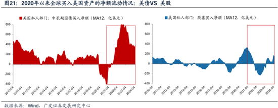 根据美国国际资本流动报告显示,2021至2023年间,全球资本持续净流入美债市场,而美股的净买入额却未及高位。在全球逆全球化的背景下,尤其是受到疫情和地缘政治不确定性影响,美债作为无风险资产,其确定性溢价进一步放大,吸引了更多的全球资本涌入美债市场。