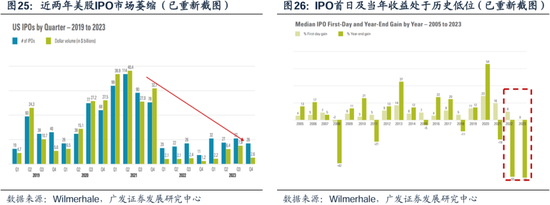 21年之后美股的一级市场谈不上繁荣,且IPO首日的情绪一般,侧面印证了资金面的充裕程度。近两年高利率环境下美股IPO市场急剧萎缩。相比20-21年美联储宽松周期下的IPO繁荣,近两年在美联储持续加息及经济总量不景气背景下,美股IPO数量与金额急剧下滑。IPO首日收益率可以较好衡量市场情绪与微观流动性水平,当前美股IPO企业上市收益亦处于历史极值水平。