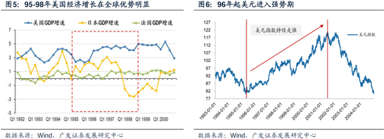 这种经济形态在全球具备相对优势,是吸引全球资金流入、美元强势的根基,也为科网带来了源源不断的增量资金。92-98年美国经济相比全球其他经济体的优势不断明显化,因此也在不断吸引海外资金购买美元资产,美元指数也从1995年开始进入了明显的上行通道。