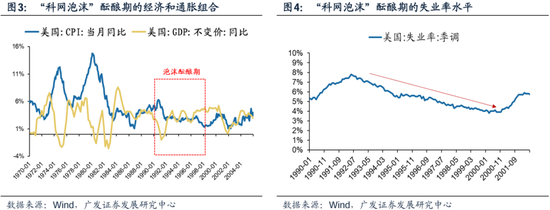 二、美国经济衰退前后,科网泡沫如何定价 24年8月,全球一些新的变化,使得投资者再度关注90s科网泡沫的历史。“美国衰退预期”与“美联储降息交易”在90s如何影响科网?如果美国经济韧性、或者强势美元预期发生逆转,是否对科技股构成风险? (一)泡沫的温床:90s平稳的经济、增长的优势、强势的美元 90s科网泡沫是“天时地利人和”的结果,不过,若要究其根本,90年代美国经济处于一段比较稳定无忧的发展周期,是整个科网泡沫的温床。 与70-80年代相比,90年代美国的经济周期波动不明显,有很强的稳定性,且长时间保持在GDP的正增状态。 在酝酿“科网泡沫”的1991-1998年,美国的经济增速并不能说非常突出,但具备很强的稳定性——90年代以后美国GDP增速的高点一般在4.5%左右,而在此前美国的经济周期中,GDP的高点一般6%以上;另一方面,90年代美国的周期波动并不明显,有很强的稳定性,GDP基本是在2.5%到4.5%之间窄幅波动,这是以往的经济周期所不可比拟的(以往的经济周期GDP一般都会出现负增长)。 此外,当时美国的通胀水平和失业率均处于持续的下降通道之中,因此当时处于难得的“稳增长、低通胀、低失业”时期,可谓经济发展的“黄金时期”。