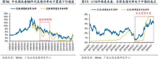 (四)资金加速涌入美元资产,但90s是流入权益、本轮增持美债 无风险资产的锚即美债利率的趋势及位置,还是有所不同——以10-15年的中期维度来看,90s美债利率持续下行,当前处于近15年的高位。 而以中长期维度来看,90年代美债利率处于持续震荡下行的通道,流动性的泛滥程度有所差异——在1991-1998年的“科网泡沫”酝酿期,美国国债收益率从8%下降到4.2%,联邦基金目标利率从6.75%下降至5%。 贴现率的水平、及贴现率的边际变化方向,都会影响美股科技公司的理论估值中枢,也会影响美债 VS 美股的资产比价。
