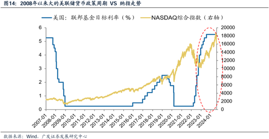 当前需要思考的是,目前是否处于相似预期的拐点?或者说,美国韧性增长与强势美元的根基是否出现了松动? 我们如果拉长周期来看,自09年至23年的一轮大的美联储紧缩周期,也是推动纳指不断上行的一轮大周期。2022-2023年的加息周期仅短暂地遏制了纳指上行的脚步,更多地是对美国相对强劲基本面及利率中枢的定价。 这种长周期的利率中枢的上移伴随着全球资金涌入美国,而当前进入了小周期的利率中枢拐点。