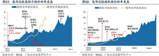若以划时代的爆款产品为坐标起点,可以看到英伟达跟当年的科网巨头相比,第一波上涨斜率更为陡峭。以革命性的产品推出为参考坐标,英伟达当前股价上涨斜率已超95年的英特尔、98年的微软。