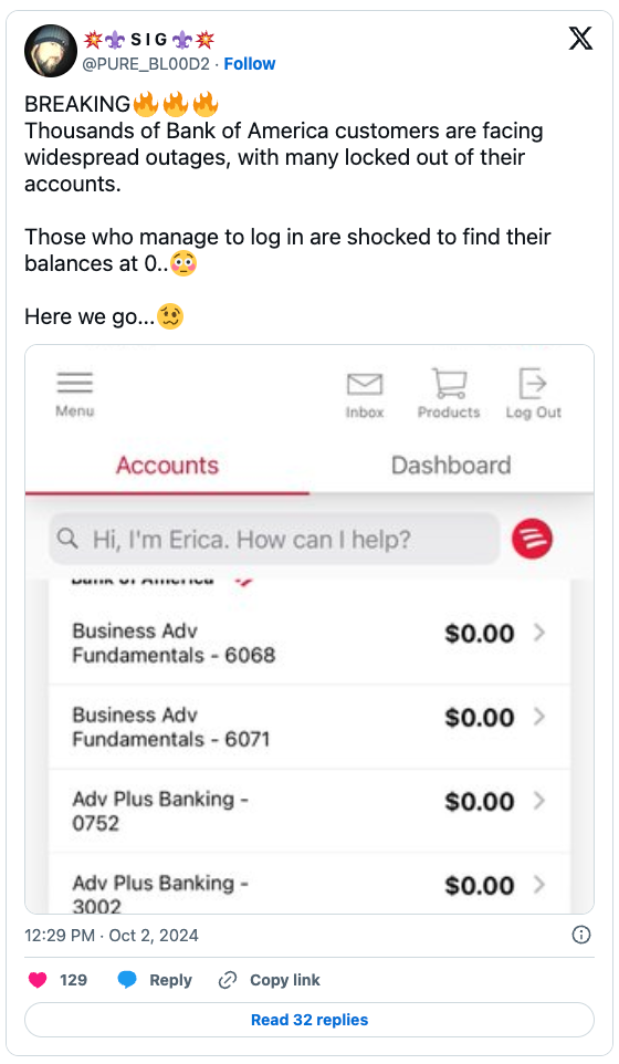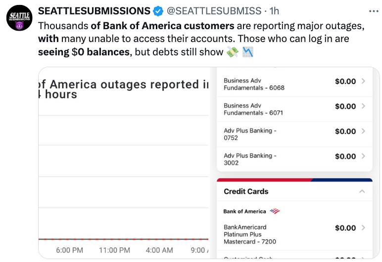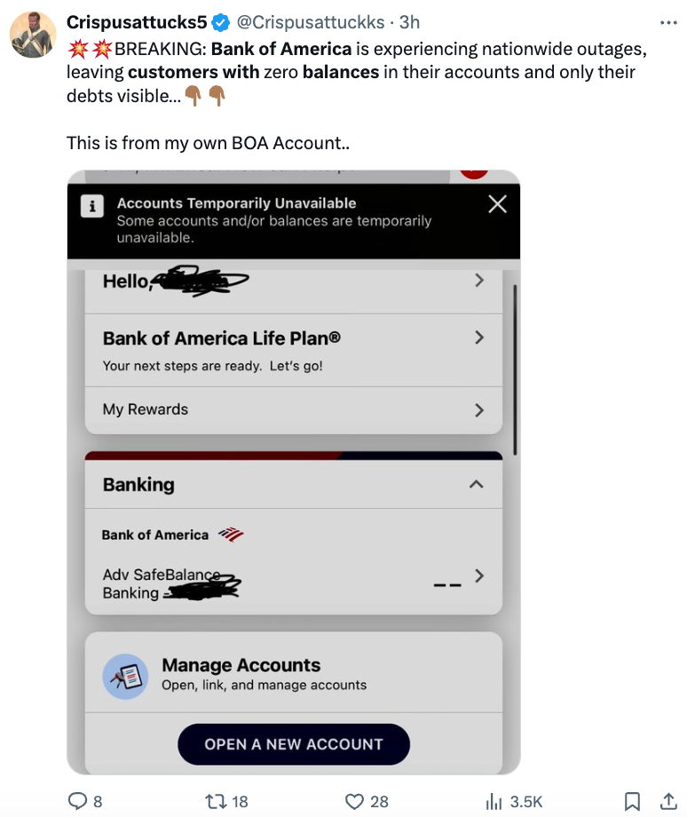 据CBS新闻10月2日报道 美国银行(Bank of America,BOA)的许多用户周三报告说,他们无法访问自己的银行账户,一些人的账户余额显示为0美元。![]() 来源:CBS新闻报道截图 据报道,周三中午,有关美国银行出现大规模故障的报告在社交媒体上疯传。许多华人用户称他们无法登陆、无法在网银、手机APP和ATM上查看自己的账户余额。一些人报告说他们可以查看账户,但却惊愕地发现自己账户的余额为0美元。 ![]() 图片来源:洛杉矶华人资讯网读者 一位洛杉矶华人资讯网的读者分享说,自己美国银行所有账户的余额均显示为0美元。 一些用户在可以报告和查看各种服务和网站故障或中断情况的在线平台DownDetector上报告说,自己的美国银行账户出现问题。 根据DownDetector的报告,美国银行此次故障报告始于美国东部时间中午过后不久,截至下午3点,约5000名该银行的用户向DownDetector报告了这一问题。 ![]() 图片来源:downdetector网站截图 追踪网站显示,这次故障涉及全美多地,包括纽约、芝加哥、休斯敦、洛杉矶、旧金山和西雅图等大城市。 美国银行在一份声明中表示:“一些用户今天在访问他们的账户和查看余额时遇到了问题。这些问题正在处理中,并已基本解决。对于给您带来的不便,我们深表歉意。” 但该银行拒绝透露发生这些问题的原因。 此后仍有许多华人用户继续报告无法登陆等情况。目前尚不清楚所有系统故障何时才能完全恢复正常。 ![]() ![]() ![]() 许多网友在社交媒体分享了自己遇到的问题。一位网友在X上写道:“还有谁的美国银行账户余额显示为0美元?” 另一位用户写道:“美国银行网站出现了故障,现在我所有账户余额都显示为0美元!他们应该赔偿这一故障对用户造成的痛苦和折磨,因为我那一瞬间真的感到压力非常大!” |