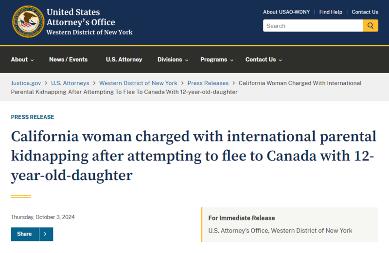 9月27日晚上约8点半,一辆带有纽约州车牌的丰田轿车在纽约尼亚加拉瀑布的彩虹桥出入境口岸被拦下。车内有两名乘客:55岁的田美(Mei Tian,音译)和她12岁的女儿。 经过一番问话后,来自加州尔湾的田美当场被捕,并被控以国际父母绑架罪,而她的女儿随后与父亲团聚。 ![]() ![]() 负责此案的纽约西区联邦助理检察官曼果(Aaron J. Mango)表示,当晚田某和女儿乘坐Uber试图入境加拿大,但因一名官员对田某的入境资格产生怀疑而被拒绝。 田某提供了一封声称得到丈夫许可的手写信,允许她携带女儿出国,但该官员质疑信件的真实性,认为签名可能是伪造的,因此,母女两人被拒绝入境加拿大,重新回到美国。 美国海关和边境保护局(CBP)的官员在调查后发现,田某无权将女儿带出国。当被问及为何前往加拿大时,田某表示她们只是去游玩,但女儿说她们刚被拒绝入境加拿大。此时,官员看到田某拍了一下女儿的左腿,暗示她不要多说话。随后,官员将两人连同司机带至另一处进行二次检查。 在检查过程中,CBP官员发现与田某和她女儿有关的多条警报记录,其中一份由国土安全部的国家目标中心(NTC)撰写的记录指出,田某的未成年子女根据法院命令被禁止离开美国。联系NTC后,CBP官员得知田某自今年8月以来一直携女儿"潜逃"海外。 国务院官员提供了一份加州橙县高等法院的临时紧急令,明确规定父母双方在未经法院批准的情况下均不得将女儿带离橙县及周边地区。 ![]() CBP官员在检查田某的行李时,发现她携带了三大一小的行李箱,显示她准备进行长期旅行或搬迁。此外,她的行李中还有多份旅行文件,包括她的美国和中国护照、女儿的旅行证件及橙县出生证明。 经调查发现,田某原本计划在抵达加拿大后与女儿前往中国。Uber司机陈先生告诉CBP官员,他受雇驾车送乘客前往加拿大的一家酒店。他是在曼哈顿34街接到田美和她的女儿,并被要求送她们到加拿大尼亚加拉瀑布附近的一个地址,该地址是当地的一家民宿。 ![]() 司机陈先生表示,他完成这趟行程后会获得950到1,000美元报酬,支付途径是他接单的中国应用程式。途中,他与田某聊到她此行的目的,田某表示要去见一位25年未见的朋友,并计划在加拿大订机票,与女儿飞往中国。 ![]() 与此同时,加州河滨县地区检察官办公室也在调查她绑架女儿的案件,女儿的父亲是唯一的监护人。该办公室说,田某在探视女儿期间,原定于8月11日将女儿归还给父亲,但并未归还。8月13日,父亲申请了紧急临时命令,河滨县地方检察官随后对田的住所执行了搜索令,发现她已取消租约、卖掉车子,人去楼空。 田某目前被控国际父母绑架罪及向CBP官员作虚假陈述的罪名。这些指控最高可判处八年监禁及罚款25万美元。她的拘留听证会原定于10月3日举行,但因律师要求与翻译一起会见田美,听证会延期至下周。 ![]() 本次案件再次涉及父母一方带子女离境问题,引发关注。 为何母亲携子女出行会被指控父母绑架儿童罪(parental kidnapping)?很多华人新移民可能并不清楚,在美国和加拿大,18岁以下的孩子若要出国, 父母一方若将孩子带出国,并妨碍另一方的监护权,在美国属于联邦重罪。2014年,一位华人母亲试图带孩子回国,因前夫报警,联邦调查局接获通知后,要求已经飞出美国领空的飞机返航。飞机降落后,FBI探员逮捕了这位母亲,并以国际绑架罪对她提出指控。 ![]() 即使父母未离婚,一方仍不能擅自带孩子出境。如果为孩子办理护照,必须父母双方共同签署同意书。若违反法院关于监护权的规定,将孩子私自带往他地,可能面临父母绑架罪的指控。 ![]() 纽约州等地对此设有监控系统,若父母担心另一方会带走孩子,可向警方备案,边境口岸也会对孩子做出相关记录,防止非法出境。 |