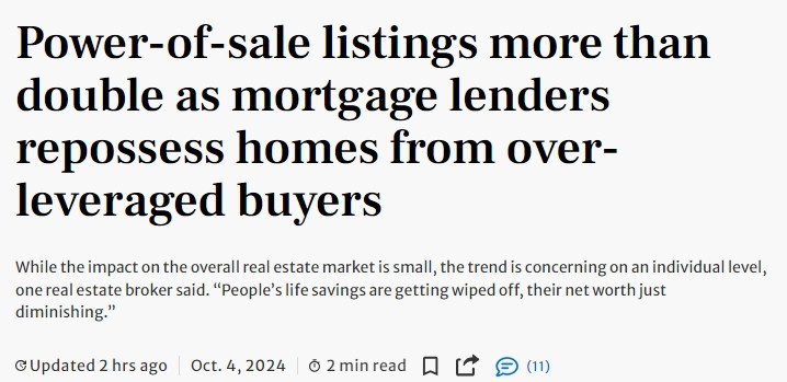 | 多伦多地区的强制出售房源(Power of Sale)在过去一年增加了112%,越来越多的房主因为难以偿还抵押贷款,被贷款机构接管房屋并出售。 Valery Real Estate Inc.房地产公司经纪兼联合创始人Anza Malik表示,今年9月,大多伦多地区共有204个强制出售房源,远高于2023年9月的96个,翻了一倍多。 图源:51记者拍摄 Malik说:“我们看到越来越多的强制出售房源出现。如果这种趋势继续,我们可能还会在未来一年或更长时间看到更多的强制出售房源。 2020年,每月的强制出售房源平均数量为4.5个。到了2021年,这一数字上升至33个,2022年增加到38个,而在2023年跳升至83个。截至目前,2024年的每月强制出售房源平均数量达到159个,为历史最高。 Malik表示,这些数据是从多重上市服务系统(MLS)中收集的,所有房源在卖方名称中都有“强制出售”(Power of Sale)的字样。他补充道,2020年之前的强制出售数据已经被归档,房地产经纪无法在MLS上获取这些数据。 专家表示,疫情期间的利率超低,当时购房的人如今开始续签抵押贷款,难以承担不断增加的每月借贷成本。许多人购买了自己负担不起的房产,现在过度杠杆化,无法偿还其他不断增加的债务。随着失业率缓慢上升,专家警告称,未来还会有更多痛苦。 房地产律师Matthew Gibson表示,过去两年,他办公室处理的强制出售案件数量与疫情前相比至少增加了三倍。贷款人客户前来找他寻求挽回损失,因为借款人无法还款。 对于那些在疫情期间以浮动利率贷款买房的人,情况更加糟糕。由于他们大多只支付了利息,几乎没有偿还本金,因此房屋中的净值较少。而且,在大多伦多地区一些地方,自2022年峰值以来,房价已经下跌了多达40%。 “更多的借款人资不抵债,陷入了破产困境”Gibson表示,“他们需要交出房屋钥匙,咨询破产顾问,从头开始。这些艰难的对话越来越多。” Spergel的持牌破产受托人Graeme Hamilton表示,他目前有三位客户因为拖欠抵押贷款,正在经历强制出售流程。银行收回了房产并在MLS上挂牌出售,房主则需要承担出售价格与所欠款项之间的差额。如果房主无法弥补差额,只能申请破产。 他说:“现在这种情况越来越多。” 大多数强制出售的房源来自私人贷款机构,这些机构的利率高于大银行。 Gibson表示:“私贷利率的变化不像大银行那样紧跟央行的利率变化。这种强制出售的增加,实际上是过去几年房地产市场狂热的症状,很多人在没有足够经验的情况下入市。再加上我们还有一个巨大的债务危机。” 加拿大的消费者破产数量接近历史高点,类似于2008-2009年经济衰退后所见的水平。根据持牌破产受托人事务所Hoyes, Michalos & Associates的数据显示,去年8月,加拿大的破产数量比上一年增加了8.9%,安省则增加了15.4%。 但Malik表示,现在还不是市场“拉响警钟”的时候。 根据多伦多地区房地产委员会(TRREB)的数据,今年9月大多伦多地区的活跃房源超过25,000个,因此200个强制出售房源只占整体房源的很小一部分。而且,拖欠三个月或以上的抵押贷款数量仍低于疫情前的水平。 尽管对整体房地产市场的影响较小,但Malik表示,这一趋势对个体来说非常令人担忧。 “人们的毕生积蓄正在消失,他们的净资产在迅速减少。” 来源链接: