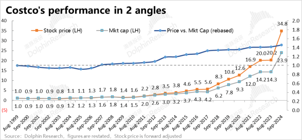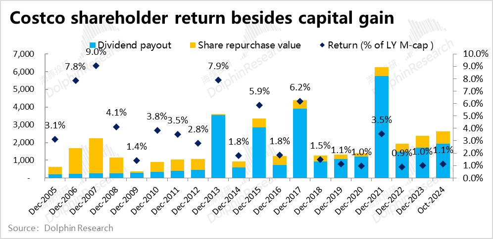 3、股东回报也难言出众 净利润和现金流角度估值都“高高在上”,那么股东回报角度Costco又有没有出众之处能解释如此高的估值? 由下图可见,1999财年到2024财年间,Costco的市值增长了近24x,但股价(前复权)则是增长了近35x,换言之,持有Costco股权的收益,实际比公司总市值的涨幅要高出约46%,这个数字实际就粗略的反映了自1999年以来Costco股东除资本增值以外的股东回报。