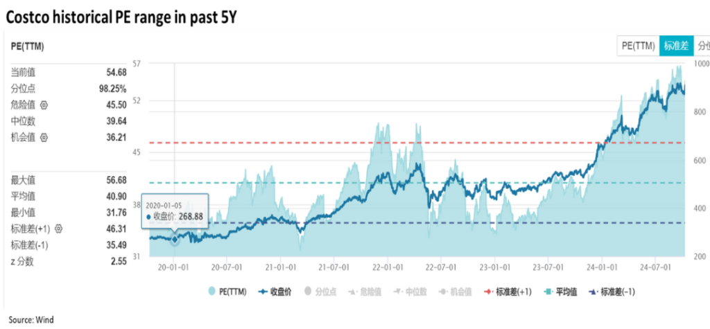 转自:华尔街见闻 Costco从财报利润、现金流估值和股东回报三个角度来看,当前的估值都显而易见的偏高。Costco的重心仍在北美本土市场和线下零售上,并未展现能出靠海外和线上市场来拉高增长的迹象。长期视角来看,以当前价格买入,能赚到的收益率,就取决于Costco的永续利润增速比5.5%还要高出的幅度,恐怕空间也是非常有限的。 一、Costco贵的合不合理? 1、近年估值飞涨,进入明显偏高区间 由下图可见,从1999年至2024年每财年末PE的均值为27.9x,而目前(24财年末)Costco的PE已高达近55x,已高于过去20多年PE均值2倍标准差以上。历史上,如此“高高在上”的PE倍数,Costco仅在2000时“dot.com bubble”的最高峰时有过一次先例。即便将回溯时间缩短到近5年的美股大牛市阶段,Costco目前的估值也依旧高出均值(40.9x)两倍标准差以上。