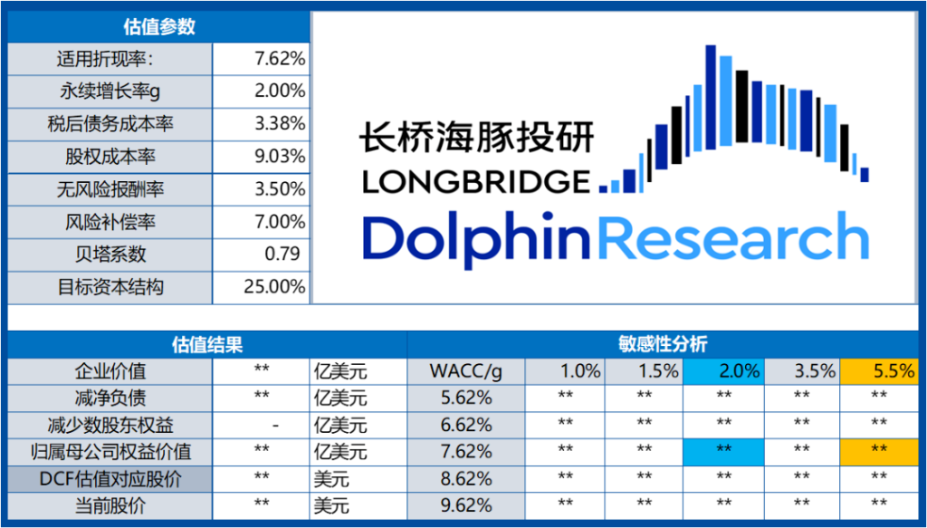 由此可见,市场对Costco的认知一定程度上类似顶尖奢侈品这种顶尖的商业模式。两者之间也确实有相似之处,例如都在定位范围较窄的优质客户群体、供给有限可控且增长缓慢、商家对于顾客的议价权极高(或者说用户忠诚度极高)等等。如此来看,Costco确实贵,但其他模式顶尖的公司是基本同样贵,Costco也并非孤例。 3、绝对估值 绝对估值上,我们采用DCF的方法。几个关键假设上,由于Costco极高的业绩确定性,beta系数较低,我们测算的WACC为7.62%,是个比较低的数字。 关键的预期差异点在对远期永续增速的判断上, 1)一般情况下,我们对永续增速是采用2%,大致相当于美国的稳态GDP增速。即大约在20多年的时间尺度内,Costco的利润/现金流增速会逐步下滑到2%。在此情况下,我们测算出Costco每股股价为$**,对应25年净利润相当于 **x PE。相比目前股价有巨大差距,但也符合历史上Costco的平均估值。 2)但Costco的特别之处之一,正在于其穿越周期的稳定增长。毕竟消费者购买食品和日用品的需求是永续的。只要线下渠道份额没有明显下跌。过去20~30年普遍稳定保持10%以上增速的Costco,在未来20~30年滑落到2%的增速似乎也确实可能偏低了。那么多高的永续增速是合理的?这个问题同样很难先验的判断。不过反向从目前的估值倒推,基于我们的假设,目前价格隐含的对Costco的永续增速要求大约在5%~5.5%之间。如此来看,预期20~30年乃至更远的未来Costco保有5%以上的利润增速看起来也算不上妄想,是有可能达到的。