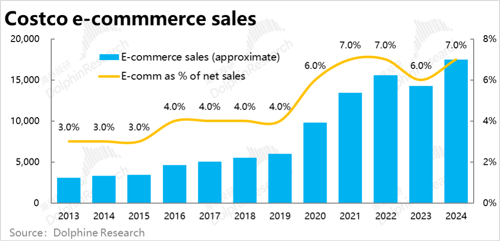 虽然线上化仍算的上一个增长方向,但从历史上看疫情前Costco的线上销售占整体的比重近10年间一直仅在3%~4%左右徘徊,可以说并无起色。疫情爆发的2020年,Costco由于线下隔离,被迫增加了在线上化的投入、并于当年以$10亿收购了Innovel solutions(一家末端配送物流公司)以充实线上零售所需的履约能力。同年Costco线上零售的占比跳跃式增长到了约6%。 但线上零售迅猛的增长势头并没能延续到后疫情时代,22财年开始Costco线上销售增长快速回落到了20%以下。线上零售的占比也再度陷入瓶颈期(6%~7%左右)。Costco的线上零售业务,在体量小(占整体比重不到10%)的同时,也没有爆发式的增长能力(增速不超20%)。因此对整体营收虽有拉动能力但也比较有限。