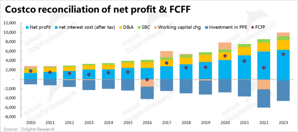 从这个角度看,Costco目前的估值无疑相当的偏贵。那么Costco近两年明显拉升的估值我们该如何理解?是可以主要归结于“泡沫,抑或是有“合理”的原因? 2、现金流角度并无惊喜 有哪些常见的原因能够解释/支撑看起来明显偏高的PE估值?: 1)最常见的解释--强劲的利润增速前景,即PE倍数 ≈ 未来利润增速,但Costco过去十多年来净利润年增速基本不超过20%,展望未来似乎也并无能明显提速的动力,对应50x以上的PE估值,显然并不能匹配。 2)另一个比较常见的合理解释是,公司的现金净利润明显且持续高于财务净利润,即尽管PE估值看起来偏高,但从P/free cash flow的角度公司的估值是比较合理。那么Costco是否属于这种情况? 从下图2010~2024财年的Costco的现金流可见,Costco的自由现金流并没有明显且稳定的高于财务净利润,相反大多数年份Costco的自由现金流反而是的低于财务净利润的。几个影响现金流的关键项目上,Costco历年的摊销和折旧普遍低于固定资产投资,反映了Costco自建物业重资产模式下持续的capex投入需求。而运营资金变动也并没贡献持续的现金流入,说明Costco同样没有持续从供应链或消费者占款的情况。换言之,Costco并不属于现金流的角度估值明显更便宜的情况。