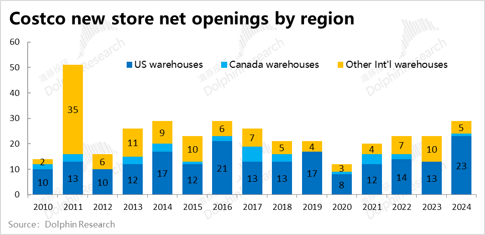 海外拓展上,可以看到Costco早在上世纪80年代刚成立初期,就着手于海外市场的拓展,至今覆盖约14个国家,截至2024财年末,海外门店(除美国和加拿大)的门店总数168家,占总体的近19%,可以说已小有成果。且从上图可清晰看到,在美国&加拿大两个核心市场和同在北美的墨西哥,其他国家的门店总数最多不超过小几十家。 从潜在增量空间的角度,全球范围内仍有大量国家Costco尚未进入,而已进入的国家中Costco的门店密度,若对标美国和加拿大也有巨大的提升空间。但有空间并不意味着Costco有能力/有意义去加速开拓海外市场。 历史上看,2010年后除2011一年外,Costco在非美国&加拿大地区的开店数量,一直明显少于美国本土的新开门店数量,每年也不超过10家。换言之,Costco在拓店时是优先考虑在成熟的北美加密门店数量,而非海外快速开拓新市场。 换言之,指望Costco明显加速海外开店节奏,拉动业绩增长的可能性也不大。